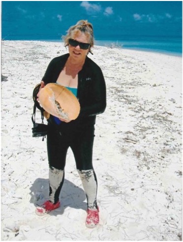 Trip 2 to the Reef was in 2002 when we were heading for the Whitsundays again but in Lady Musgrave lagoon met a photographer who was putting together a pictorial library of the present state of the coral and fish for the Smithsonian Institute in the States. He needed a skipper, boat boy and cook for his catamaran. We had a fascinating 2 weeks with David Hannan who was happy to lend us his diving gear after he had finished for the day and gave us a few of his commercial C.Ds, such as “Coral Sea Dreaming”. Sells well on the cruise ships apparently. This shell was found on the beach…and it had to stay there, so Glynne said, but would have looked good in our shell collection.