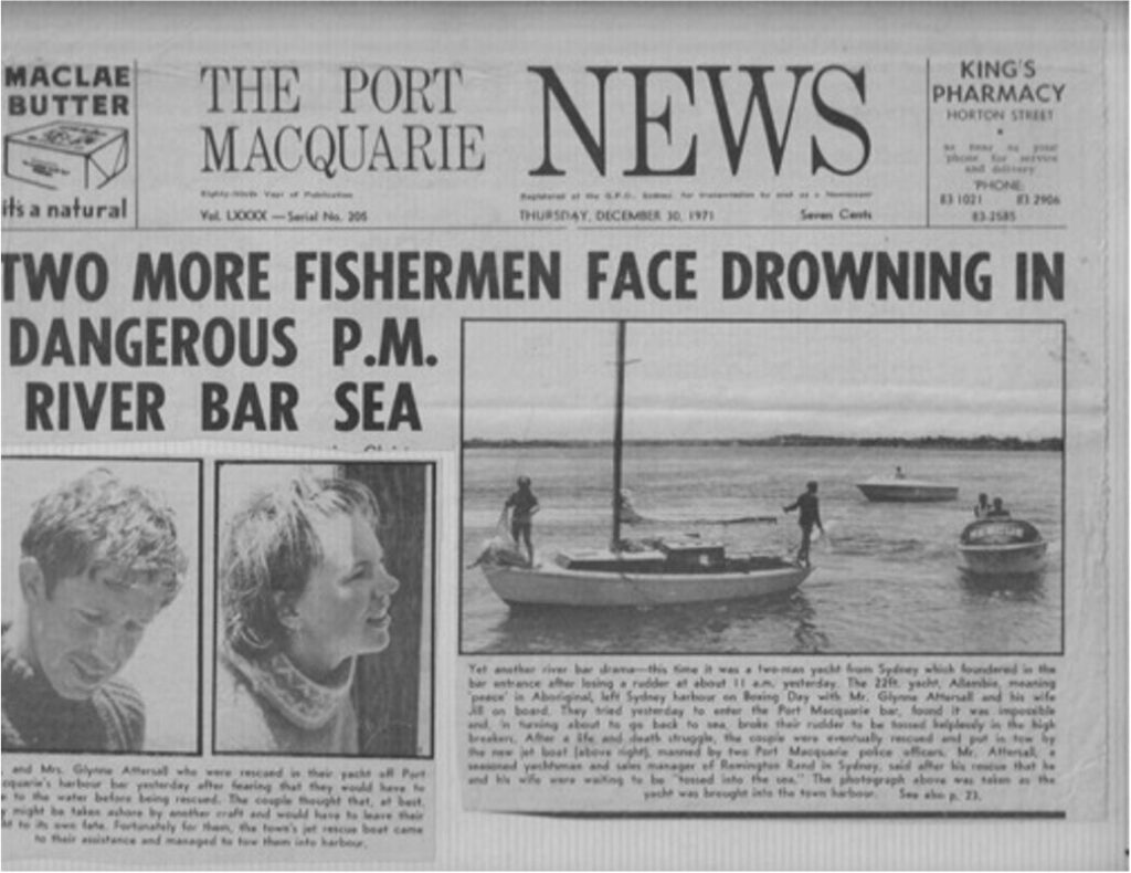 **No. 1. Lesson learnt Approaching Port Macquarie we hadn’t realised how dangerous the bar was (this is before the northern break wall was extended) or how long the river floods after high. Surfing in on an enormous, unexpected wave the lower Gudgeon pin on our transom hung rudder sheered leaving Glynne with a flailing rudder. Eventually, we had to be pulled in from the northern lee shore by the Carnival of the Pines surf rescue jet boat. As two fishermen had drowned on the bar the weekend before the local press made the most of us. This can be made into a 3-beer story, beware!