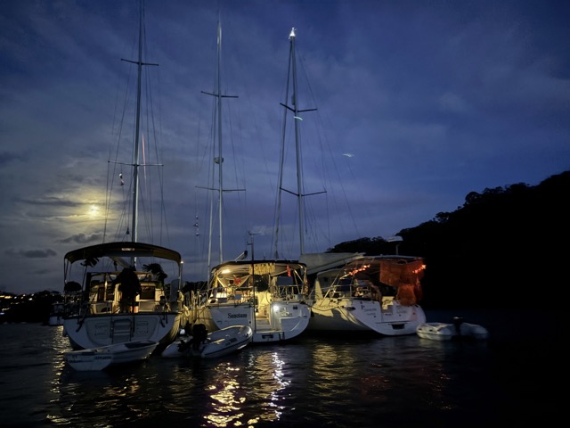The theme for this year’s Tapas Tie Up was the South Pacific. Nine boats rafted up at Sugarloaf Bay. Everyone went to great effort with costumes. We had movie stars, islanders (one in particular wearing very little), the navy, and resort guests. Boat decorating turned one boat into a veritable jungle. Machetes were almost necessary. Attendees created delectable tapas meals and intoxicating cocktails. Coconuts, pineapples, rum, leis and palm fronds were the way to go.