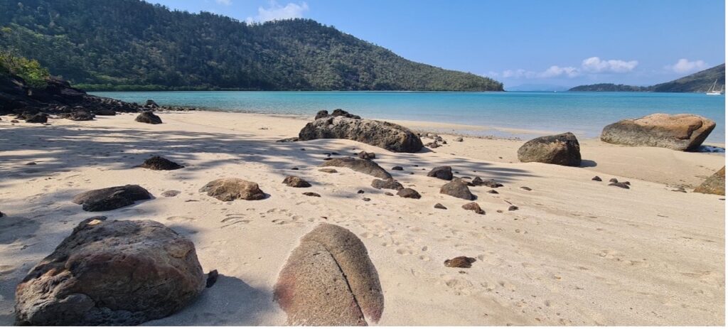 The radio communication must have sounded like a daytime TV drama to the surrounding yachties. The manager told us to call her on a mobile phone but unfortunately, we were out of range. We stopped for lunch at Tongue Bay, then walked up to the lookout and marvelled at the brochure-like view of Hill Inlet with its marbled turquoise and sand coloured expanse. The wind had picked up a fair bit by afternoon as we set a course for nearby Chalkies Beach. The radio communication with Queensland Yacht Charters resumed but reception was erratic, adding confusion to conflict. It was finally agreed that we’d meet them the following morning at Hammo which was a relief after a day of an extreme case of uncooperativeness and unwarranted aggression.